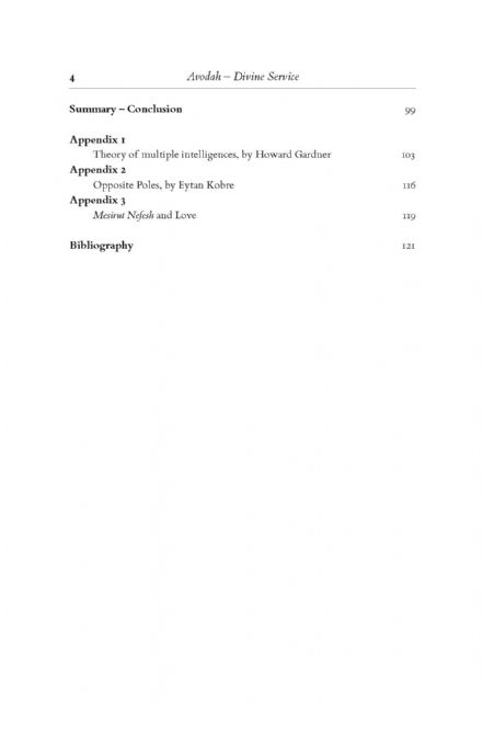 From the Preface of Avoda: “… This book discusses the heart of the Torah and it is an essay on Torah psychology what is traditionally called mussar (the study of ethics or character development). It surveys the assumption made by a number of commentators that prayer rectifies the negative trait of honor seeking. This work is not a technical Kabbalistic discourse. However Torah psychology is certainly grounded in the psychological principles of the Kabbalah, which can be defined in this sense as the study of the relationship between the soul and body, and this work draws freely on this understanding…”