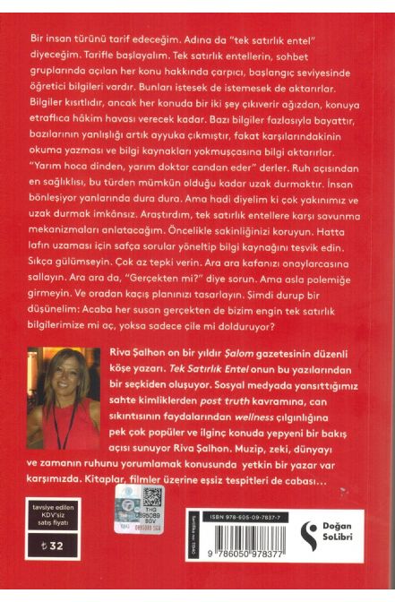 Riva Şalhon on bir yıldır Şalom gazetesinin düzenli köşe yazarı. Tek Satırlık Entel onun bu yazılarından bir seçkiden oluşuyor. Sosyal medyada yansıttığımız sahte kimliklerden post truth kavramına, can sıkıntısının faydalarından wellness çılgınlığına, insana dair pek çok konuda şaşırtıcı bir bakış açısı sunuyor Riva Şalhon. Muzip, zeki, dünyayı ve zamanın ruhunu yorumlamak konusunda yetkin bir yazar var karşımızda. Kitaplar, filmler üzerine eşsiz tespitleri de cabası...