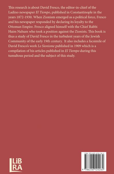 This research is about David Fresco, the editor-in-chief of the Ladino newspaper El Tiempo, published in Constantinople in the years 1872-1930. When Zionism emerged as a political force, Fresco and his newspaper responded by declaring its loyalty to the Ottoman Empire. Fresco aligned himself with the Chief Rabbi Haim Nahum who took a position against the Zionists. This book is thus a study of David Fresco in the turbulent years of the Jewish Community of the early 19th century. It also includes a facsimile of David Fresco’s work Le Sionisme published in 1909 which is a compilation of his articles published in El Tiempo during this tumultuous period and the subject of this study.