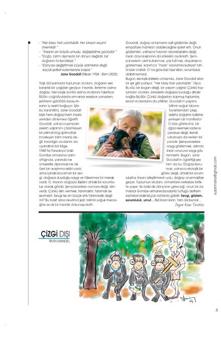 Bugün, ekolojik krizlerin ortasında, Jane Goodall elan bir ışık gibi parlıyor. “Her birey fark yaratabilir,” diyor. Bu söz, bir slogan değil, bir yaşam çağrısı! Çünkü toplumların vicdanı, bireylerin doğayla kurduğu ahlaki bağla ölçülür. Çünkü doğadan kopmuş toplumlar, kendi vicdanlarını da yitirirler. Goodall’ın yaşamı, bilimin soğuk laboratuvarlarından çıkıp, adeta doğanın kalbine yerleşen bir manifesto! O bize gösterdi ki, bir ağacı kesmek sadece çevreye değil, kendi ruhumuza da verilen bir yaradır. Şempanzelere saygı göstermek, aslında insan onuruna saygı göstermektir. Bugün, Jane Goodall’ın öğrettiği şey tam da bu: Doğayı korumak, yalnızca ekolojik bir görev değil, ahlaki bir sorumluluktur. İnsanı iyileştirmenin yolu, doğayı onarmaktan geçer. Toplumun vicdanı, ormanların nefesiyle birlikte yaşar. Ve belki de dünyanın geleceği, onun bir zamanlar Gombe ormanında sabırla tuttuğu defterin sayfalarındaki küçük notlarda gizlidir: Sevgi, gözlem, sorumluluk, umut… Bizi insan kılan, tam da bunlar…