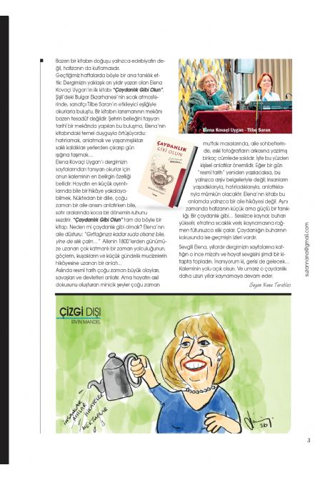Sevgili Elena, yıllardır dergimizin sayfalarına kattığın o ince mizahı ve hayat sevgisini şimdi bir kitapta topladın. İnanıyorum ki, gerisi de gelecek… Kaleminin yolu açık olsun. Ve umarız o çaydanlık daha uzun yıllar kaynamaya devam eder.